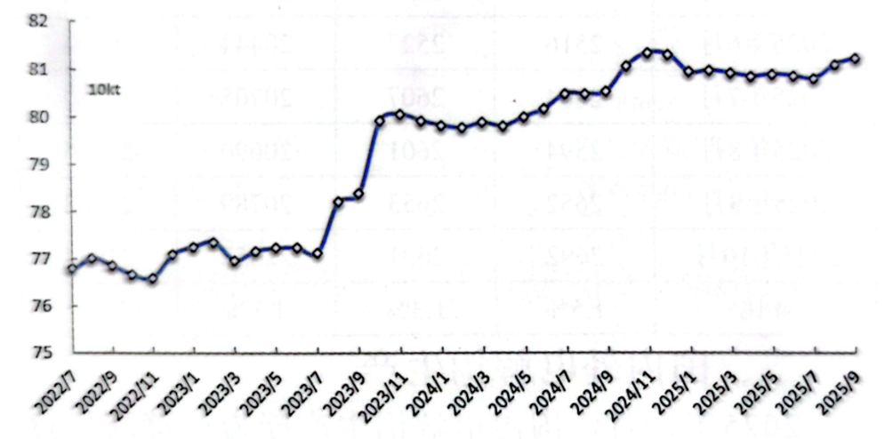 經(jīng)調(diào)整,9月份產(chǎn)量為364.4萬(wàn)噸;預(yù)計(jì)10月份產(chǎn)量為377.0萬(wàn)噸,同比增長(zhǎng)1.3%,日均產(chǎn)量約12.16萬(wàn)噸。